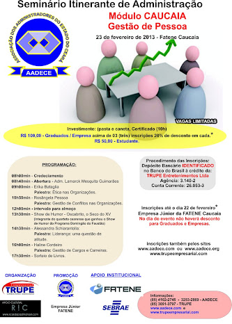 Inscrições até o dia 22 de fevereiro* Na Empresa Júnior da FATENE Caucaia ou pelos sites: www.trupeempresarial.com , OU SE ESTÁ NO BLOG DA AADECE SIMPLESMENTE CLICANDO ABAIXO NA INSCRIÇÃO